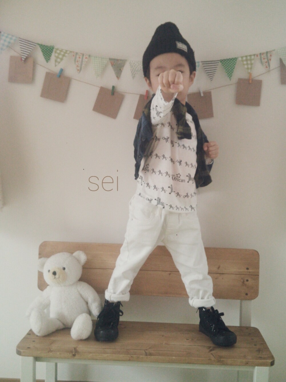 やっとお揃いコーデできたのに~ 写真は撮れなかった~😌 弟は、小窓に。 兄は仮面ライダー見たあとだったので、 グーパンチポーズ🙅 ワントーンコーデしてるつもりが、 いつのまにかモノトーン、、、?! 難し~! 皆さんの、参考にワントーン考えてみよ~♪
