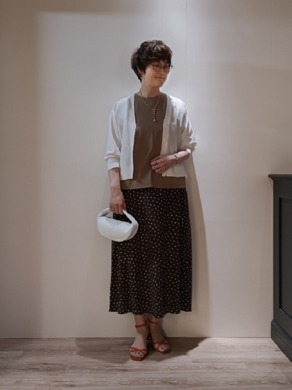 ご覧いただき有難うございます🫧 Techichiならファミリー店のマスキです👓 ………………………………………………………… ドットスカートのカジュアルコーデです🤎🤍 ドットスカートはサラッとした素材感で軽くジメジメした季節にお勧めのです!!Aライン動きやすく、変形ドットが素敵ですね🥰 カーディガンはリアルバイで、袖口のフィット感が素晴らしいです🫶 脇もあたらないので汗も気になりませんよ👓 ………………………………………………………… ⚫WEAR ✢ますき【@sei1225】 ✢Momoko【@pescadimomo】 是非フォローを宜しくお願い致します✨