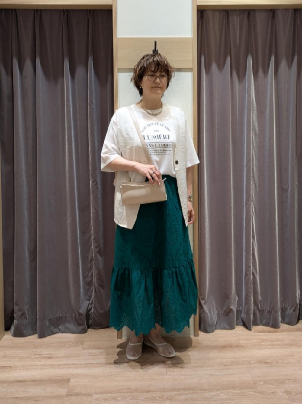 ご覧いただき有難うございます🫧 Techichiエビスタ西宮店のマスキです👓 ………………………………………………………… グリーンスカートがポイントのカジュアルコーデです🪴 アイレットレースのスカートは総ゴムでストレスフリー✨綿素材で涼しく夏のコーデに映える1枚です😍飽きのこないデザインなのでカラーをお勧めしたいです!! ジレはスッキリ見せたい時にお勧めアイテムです☝️Tシャツだけだとカジュアル過ぎる••時に羽織るだけでオシャレになりますよ🤭ノースリで着てもらうのも⭕️ シアーTシャツは透け感や袖丈/丈がベストな1枚🫶ツルンとした素材感なのでINもしやすいですよ🎶肌当たりも良く、いつもと違うTシャツをお探しの方にお勧めです🤗 ………………………………………………………… ⚫WEAR ✢ますき【@sei1225】 是非フォローを宜しくお願い致します✨