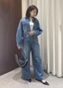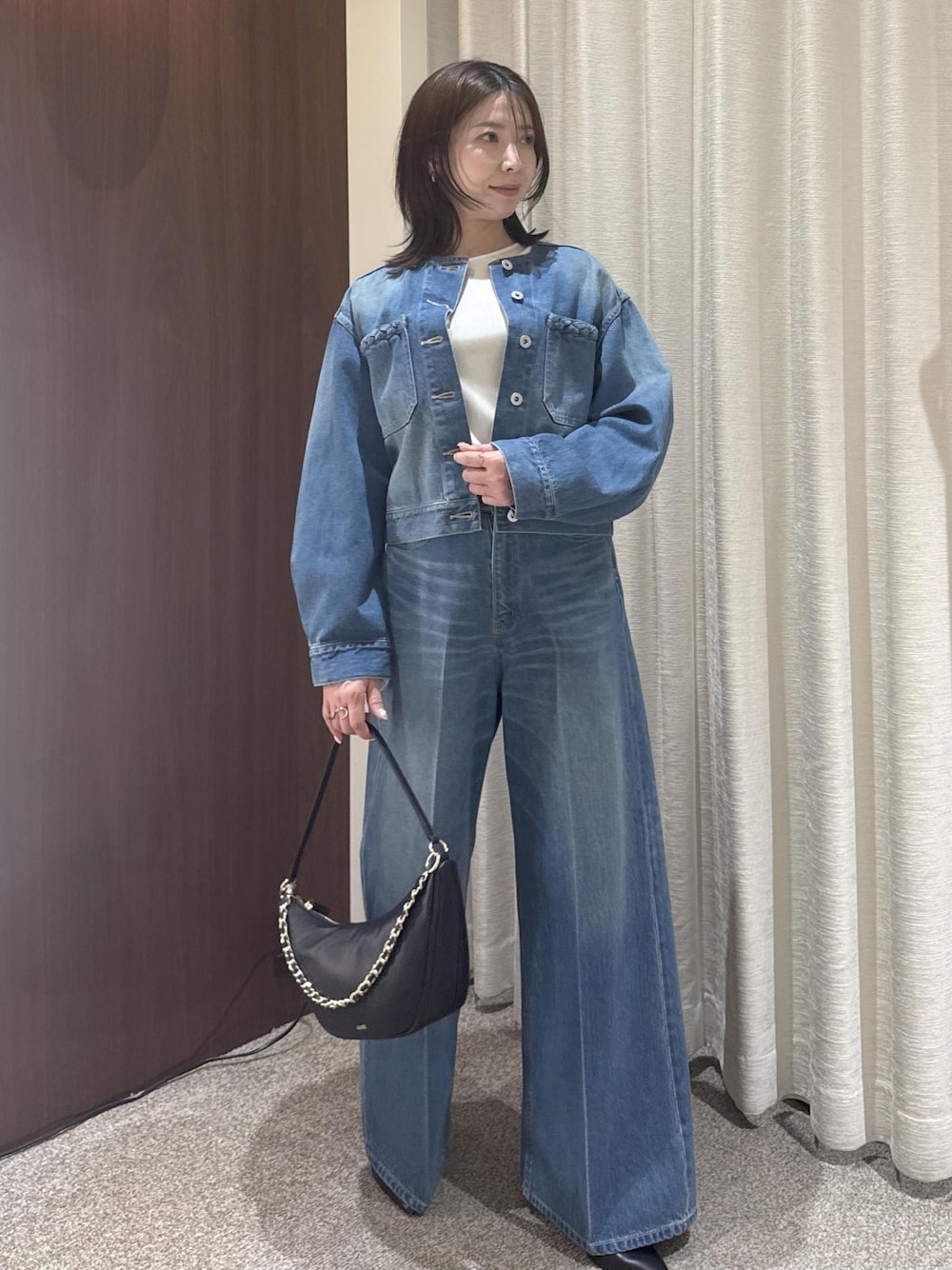 コンパクトなデニムジャケットにワイドデニムを合わせたセットアップスタイル。 ブラック小物で引き締め、カジュアルすぎない大人のデニムコーデにしました。