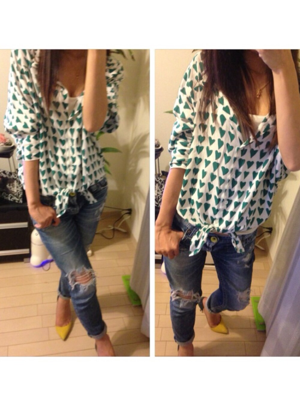アクセサリー :クロムハーツ パンプス:ダイアナ デニム:ロデオ トップス:不明 グリーンのハート柄♡♡♡は、またまた韓国で購入♪ゆる~いシャツです☆