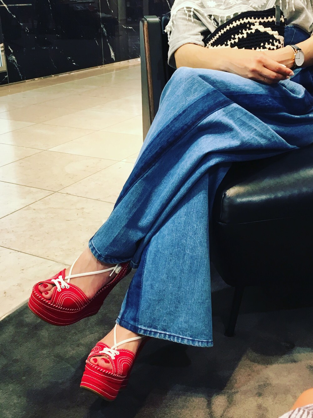 ブルー系のデニムパンツ、レッド系のサンダルを着用したレディースの夏コーディネートの1枚目の写真