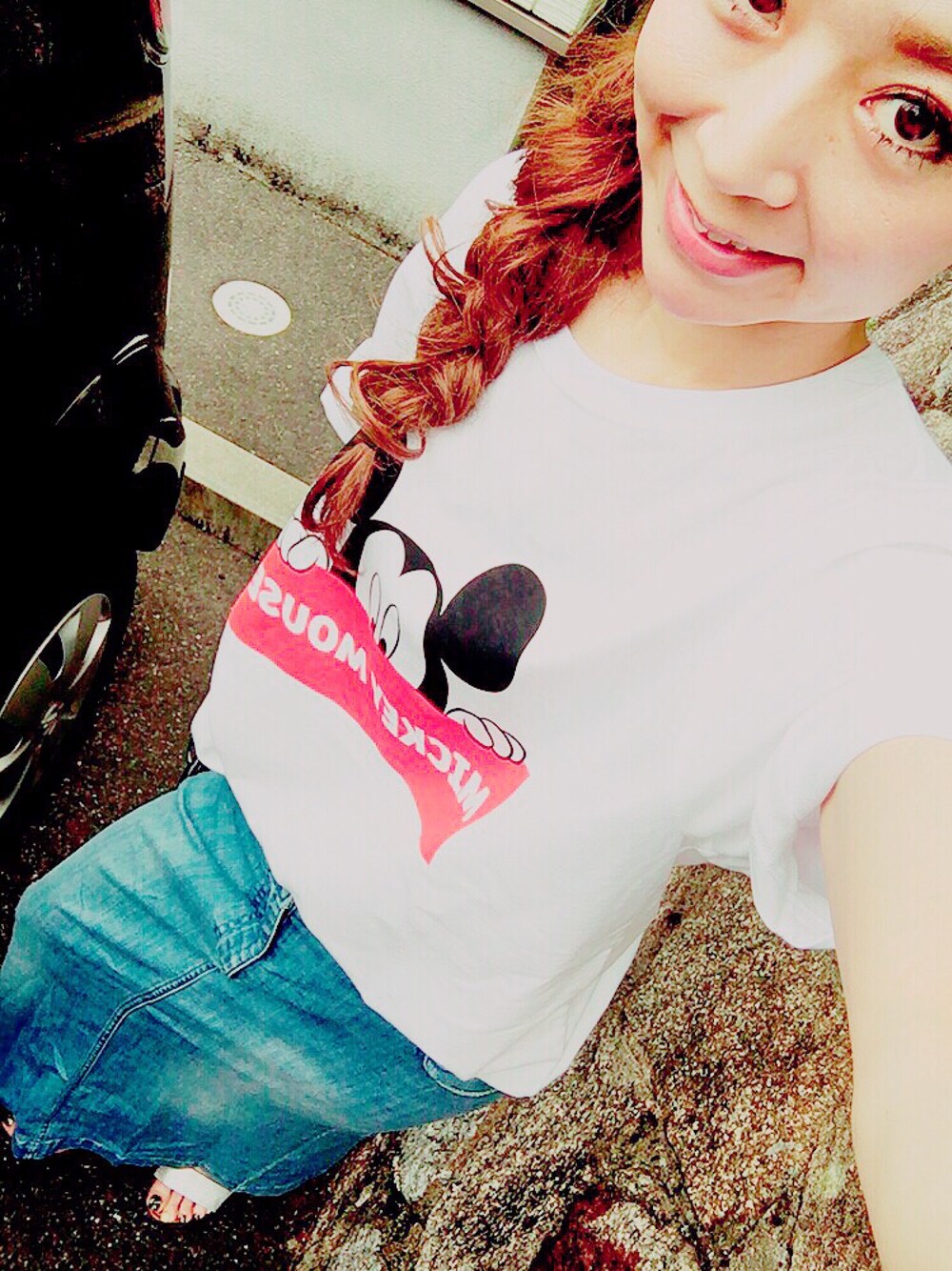mickey T-shirt💛 人が着てたら可愛い(´ω`) 自分が着るといまいちなんかも笑 目があるT-shirtに抵抗ありなもんで😅 ロングのデニムスカートはかなり楽〜〜! 暑くてやってられない(つД-`)