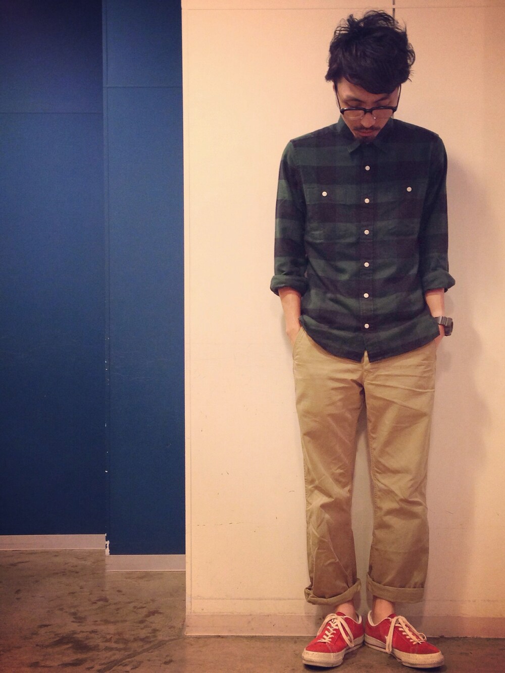 赤いきつねと緑のじじい シャツ 無印良品 パンツ avontade 靴 convers