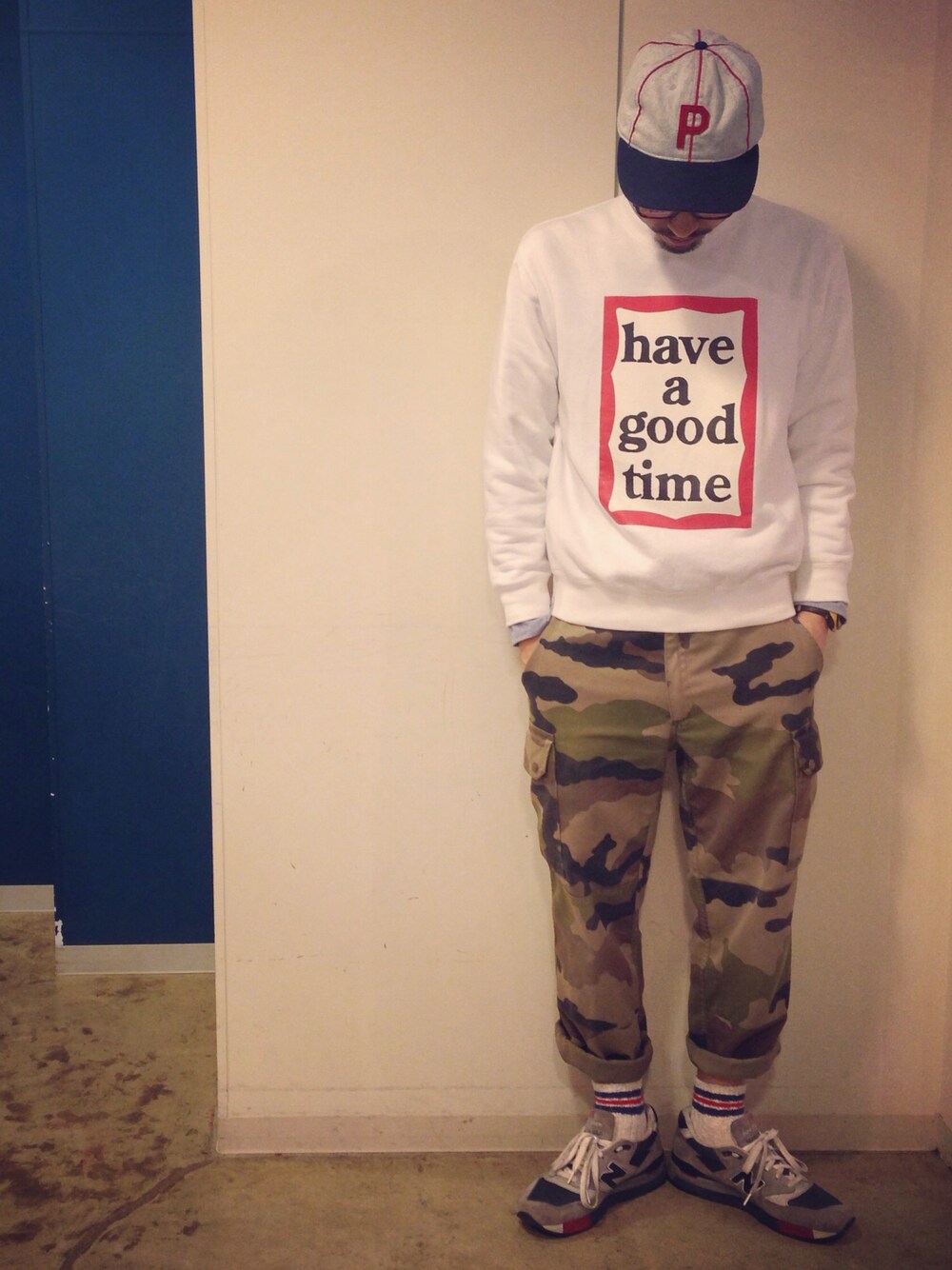 have a goodじじい 白いのすぐ汚すヤツです シャツ muji スウェット have a goodtime パンツ 古着 靴 NEW BALANCE