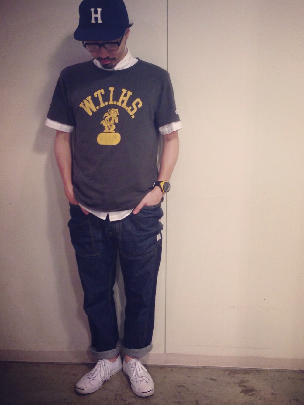 we are the championじじい シャツ muji Tシャツ champion デニム ササフラス 靴 コンバース ジャックパーセル