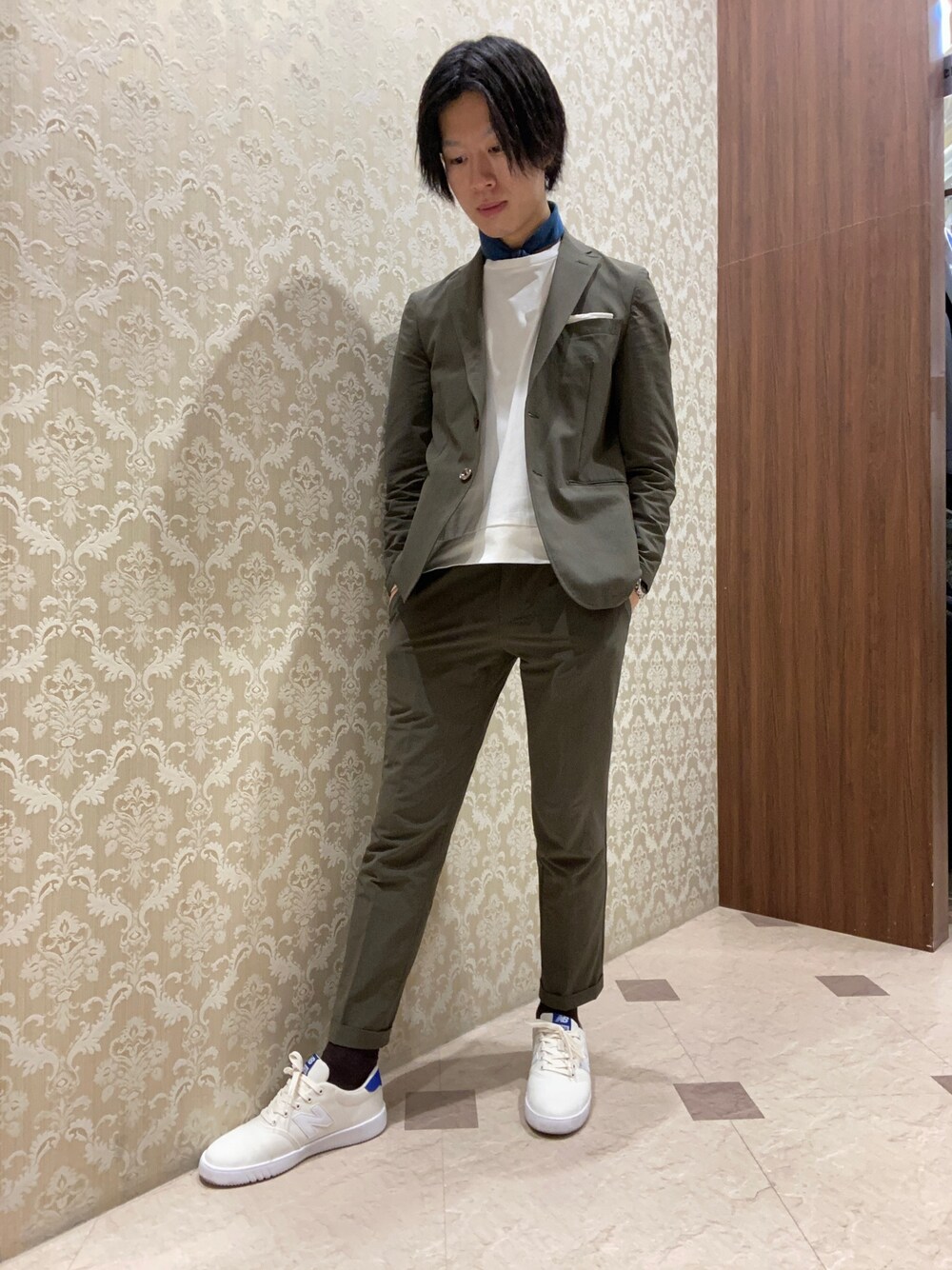 カーキ+白+青 白Tシャツ、白スニーカー、白チーフで合わせて、ニューバランスのロゴの青を、青バンダナで拾ってます^^