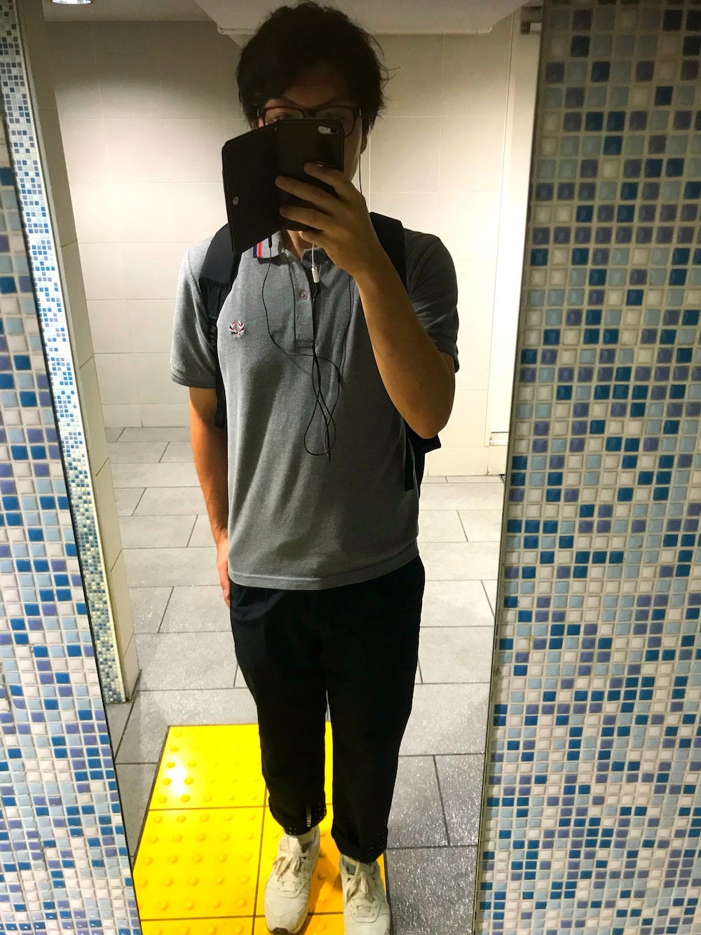 グレーのポロシャツ、痩せたから着れるようになりました! シンプルなファッションは手抜きに見えがちなので、靴下でアクセントつけてます!見えづらいですが...