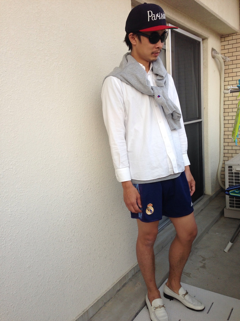 帽子:Kitsune BDシャツ:Kitsune スウェット:チャンピオン パンツ:アディダス 靴:GUCCI サングラス:ナンバーナイン 短パンスタイル