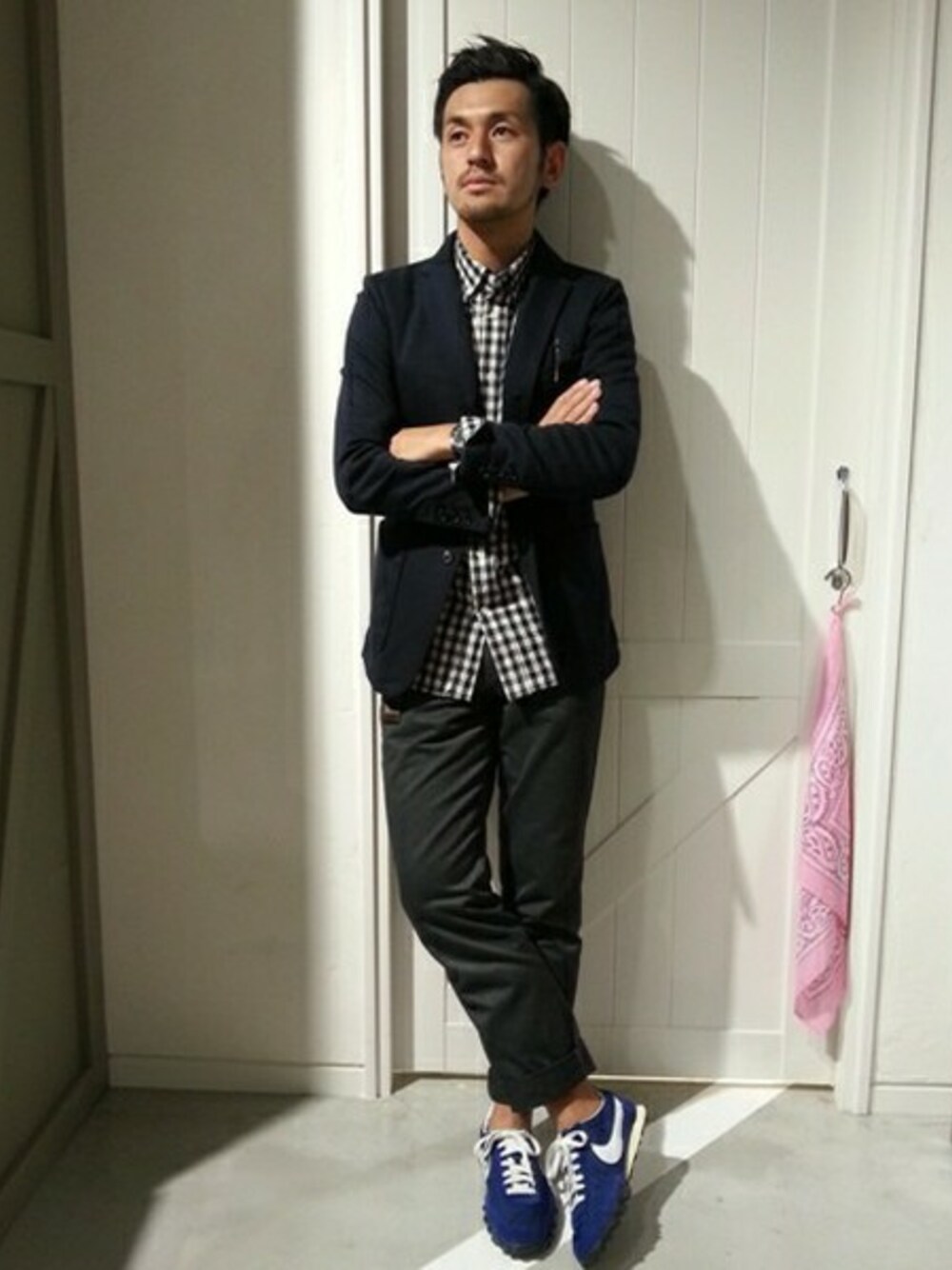 休日のジャケットスタイル。リラックス感を出すために足元はスニーカーで。これを革靴に変えるとオンでもOKです。