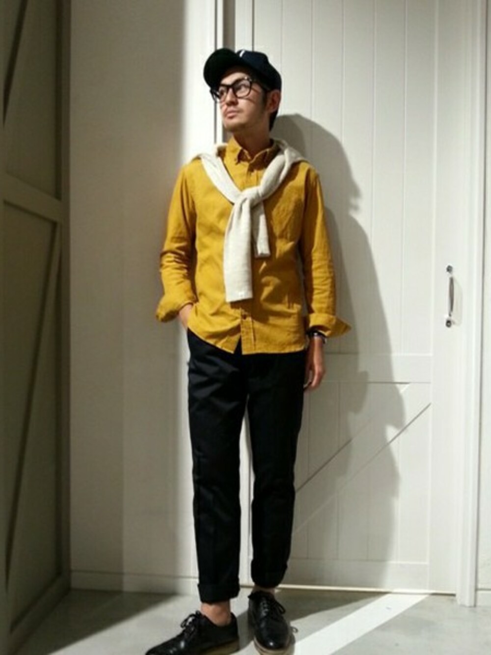 素材感抜群のコーデュロイシャツです。イエローでインパクトを出しつつ、ネイビーのパンツで大人っぽくしてます。