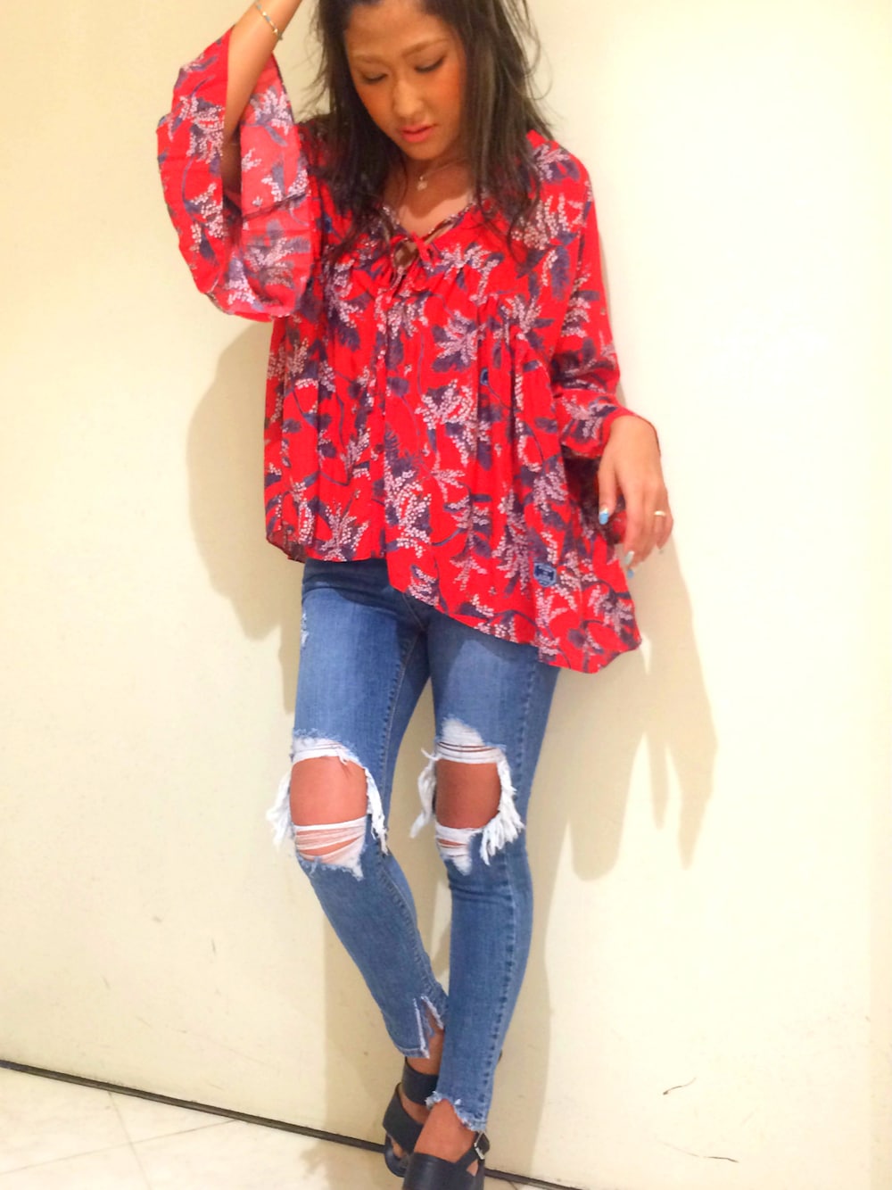 トレンドカラーの赤を取り入れました! ラフに見え過ぎないように、大胆なダメージ加工のデニムで締めました。 チュニックは胸元の紐をホルターにしてオフショルにしたり、アレンジがきく所が着回せておすすめです☆