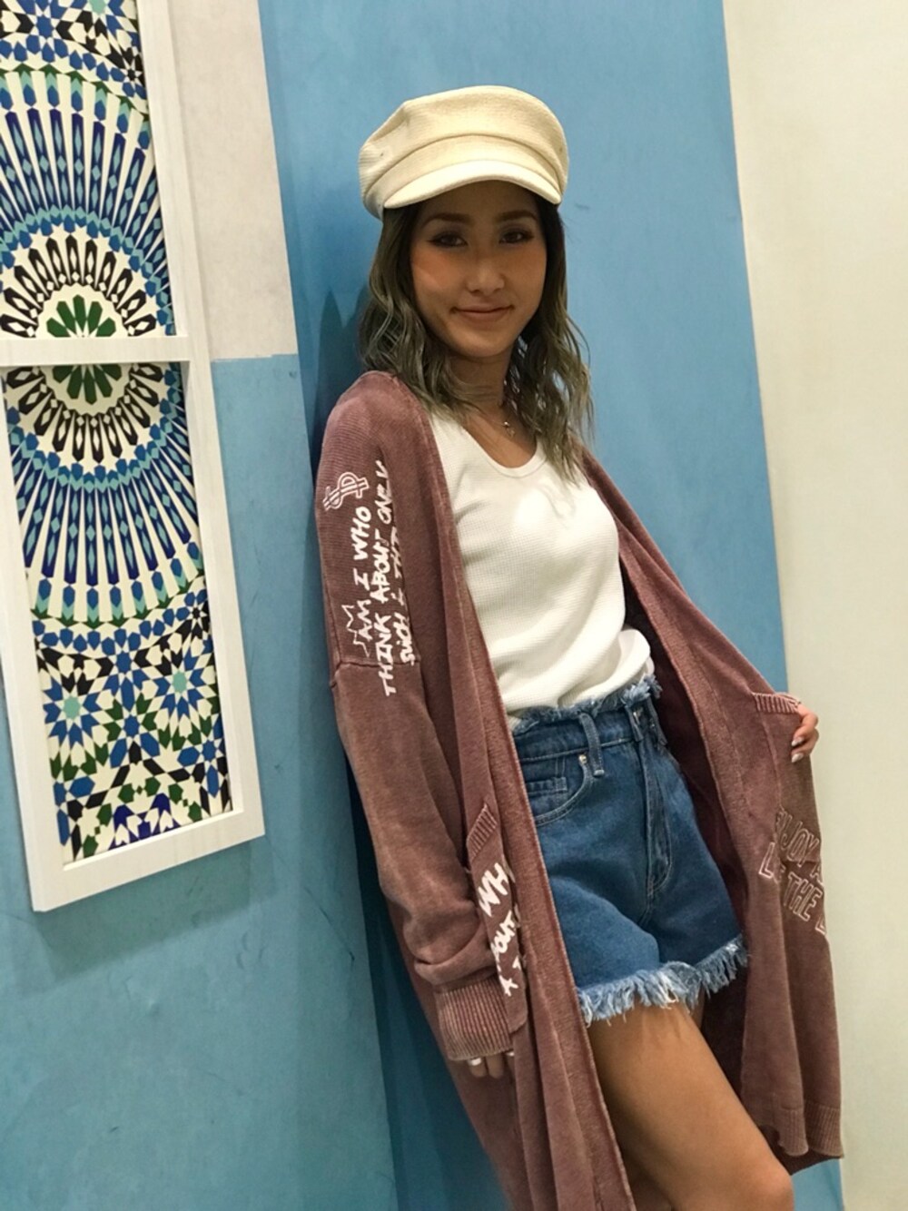 ピグメント加工のカーディガンは絶妙なピンクの色合いがお気に入り! ルーズなシルエットなのでショーパンですっきりさせました★