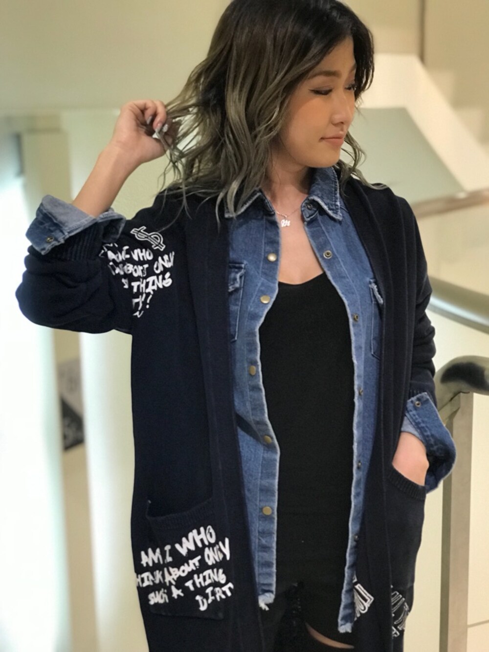 ピグメント加工のカーデは、綿素材なのでさらりとした生地感が着心地良い★ デニムシャツを合わせてヴィンテージライクな雰囲気にしました!