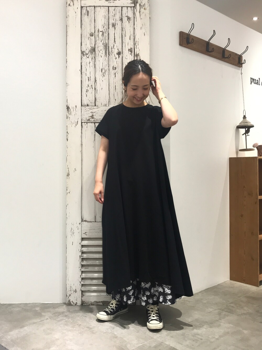 カットソーのフレアーワンピースにスカートを合わせたブラックコーデ。