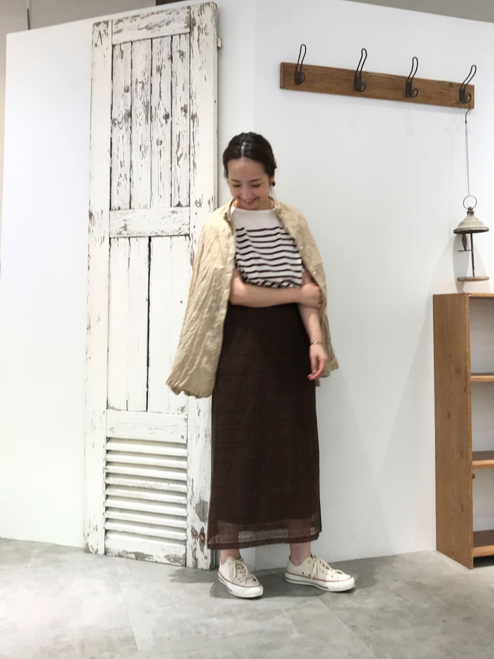 ボーダーもレーススカートもブラウンで統一。シャツをプラスすれば夏素材だけど秋っぽい装いに。