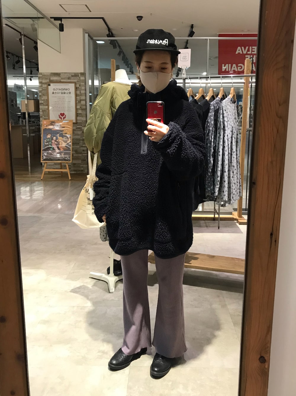 もこもこフリースにはすっきりフレアパンツ。