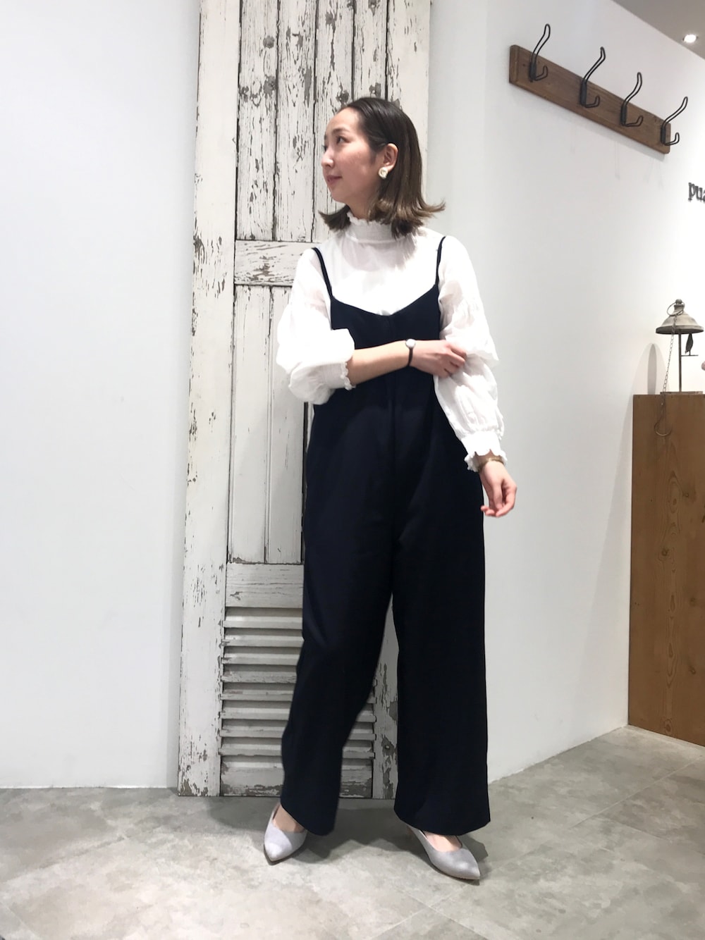 卒入学のシーンによく合うシャーリングブラウスとサロペット。