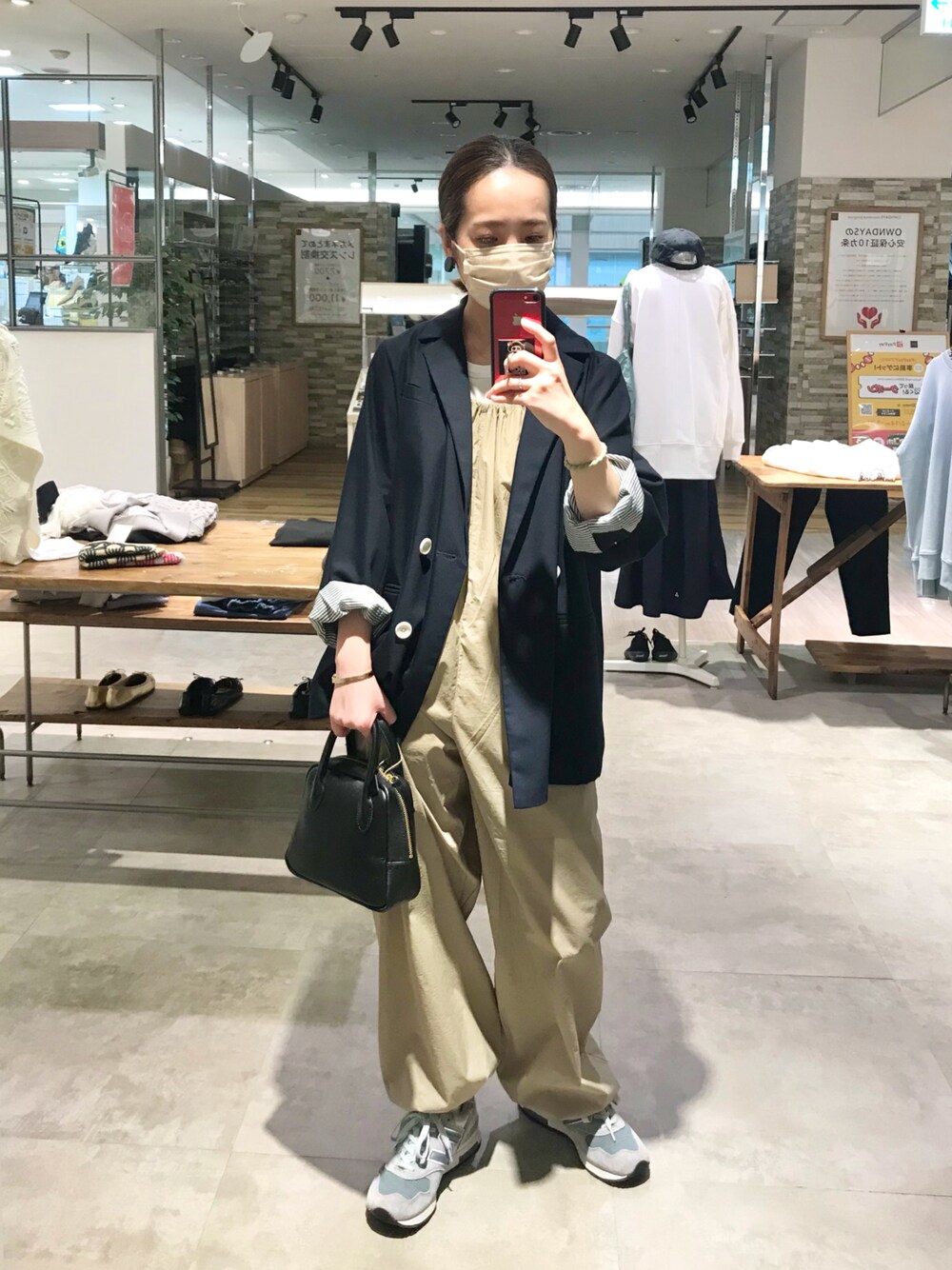 撥水加工されたサロペットにあえてかっちりめのテーラードジャケット合わせ。