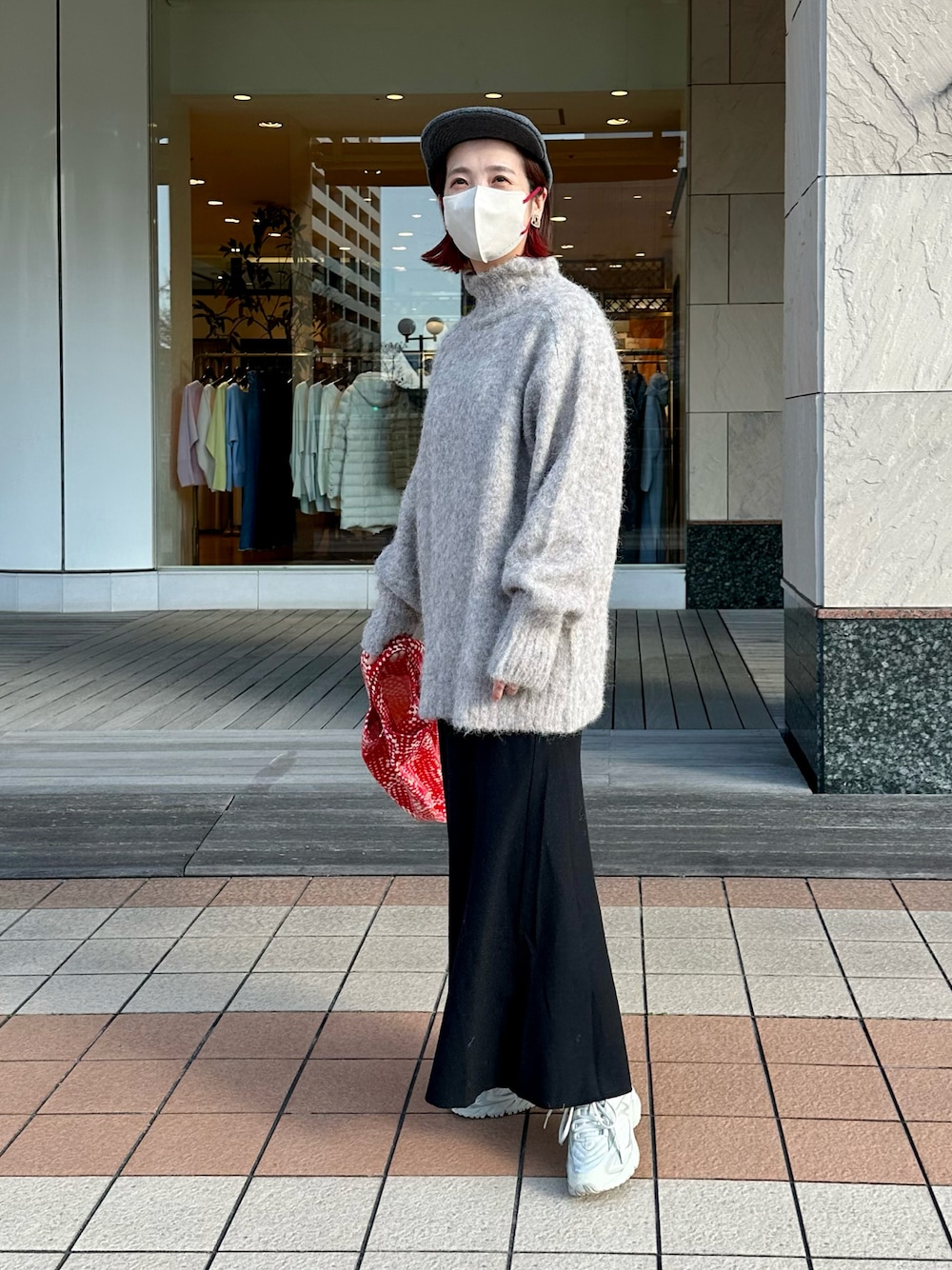 オーバーサイズのふわもこニットはプチマーメイドスカートですっきりバランスに。