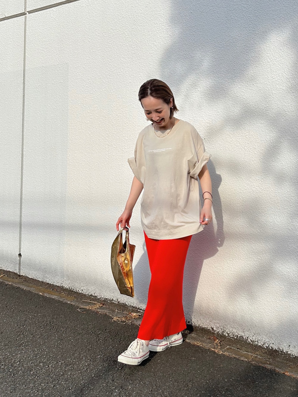 ⋆Insta / @sein___000 赤スカートにはベージュ合わせがおすすめ