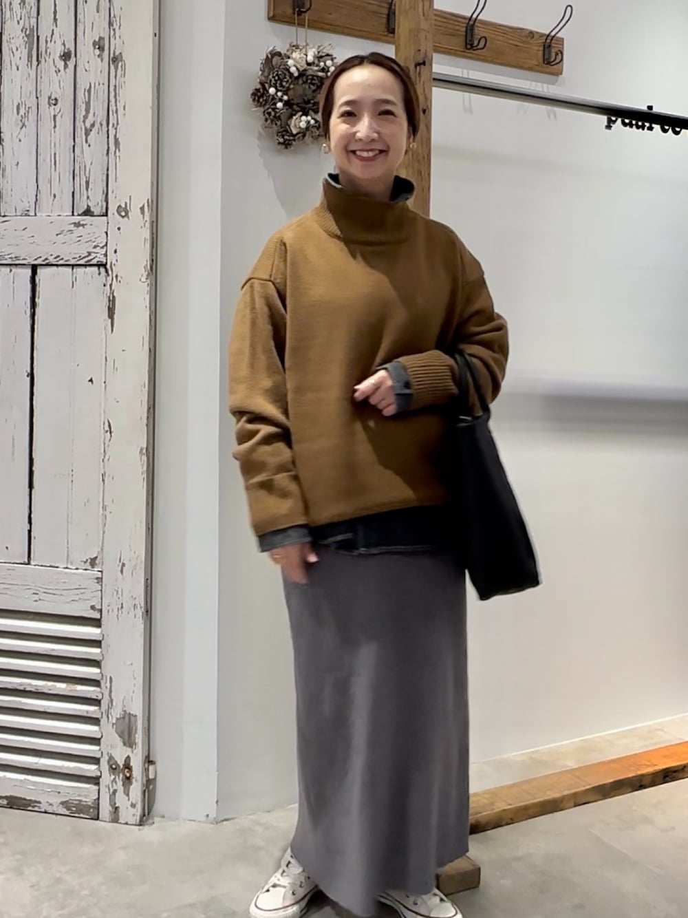 ⋆Insta / @sein___000 キャメルのニットにグレーのデニムシャツをレイヤード。 スカートもグレーで合わせてシンプルに。