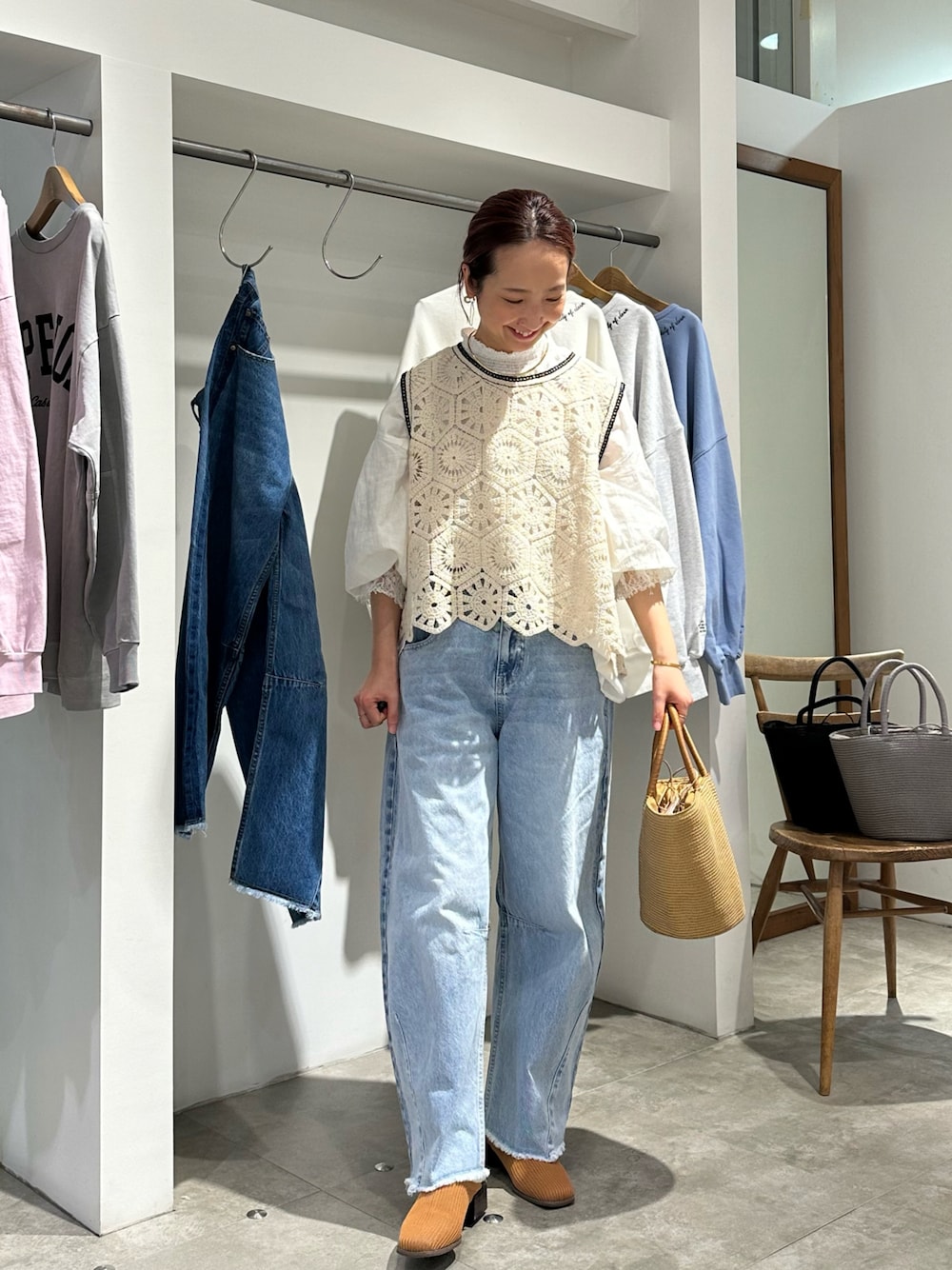 ⋆Insta / @sein___000 春に必須のかぎ針編み風ベスト。 ブラウスとのバランスが本当に可愛いです。