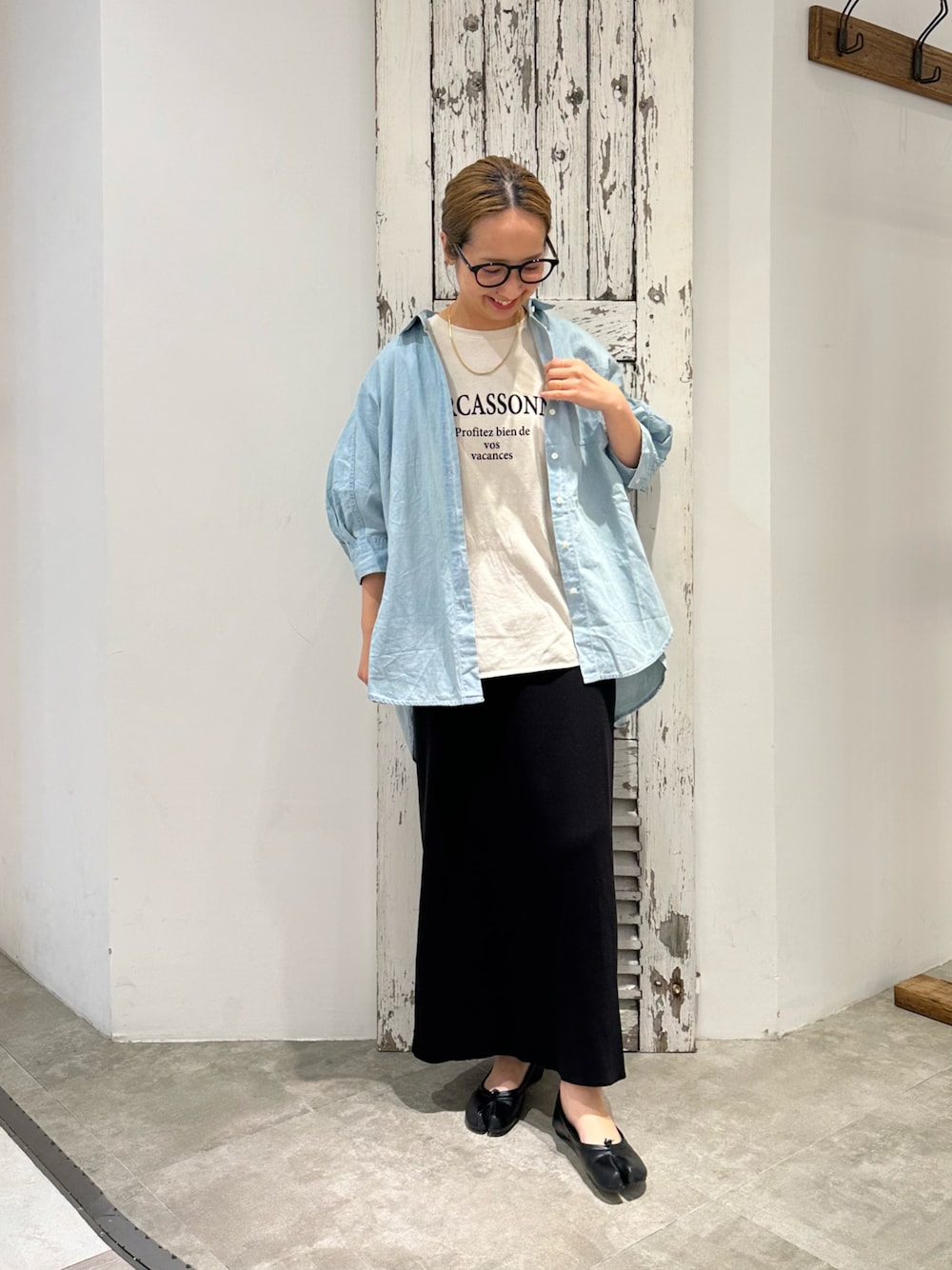 ⋆Insta / @sein___000 肘まで隠れる七分袖の綿麻デニムシャツ。 軽くて涼しく、真夏も楽しめるアイテムです。