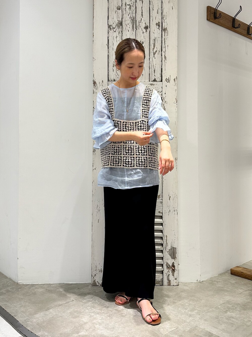 シアーブラウスとビスチェをレイヤード。 ナロースカートならトップスをインしなくてもスッキリ着れます!