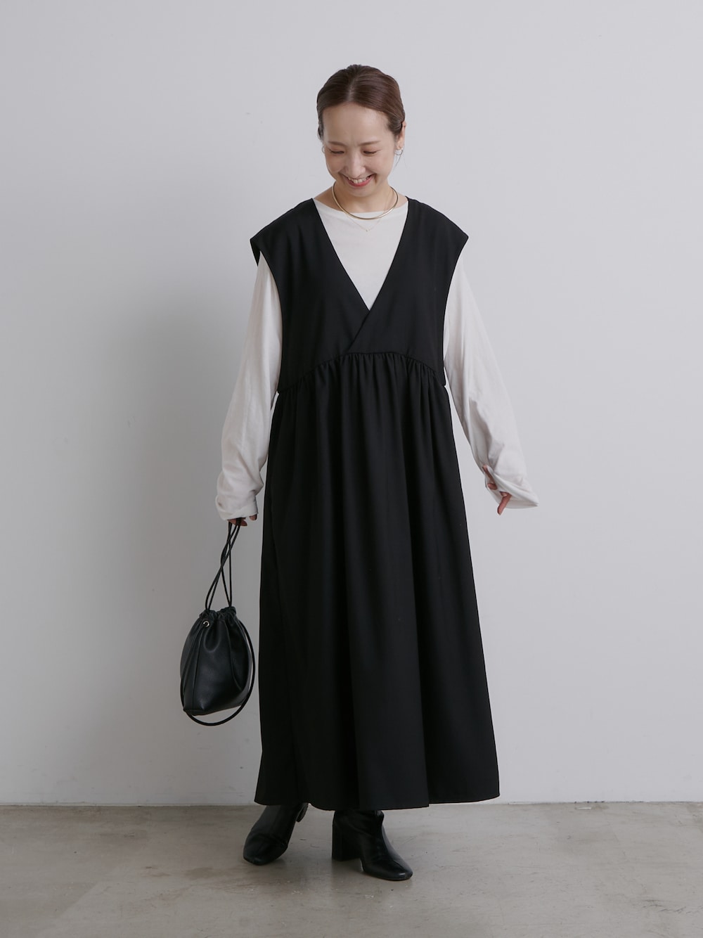 seinooo(pualcecin)のジャンパースカート「【Du noir】深Vネックジャンパースカート」を使ったコーディネート