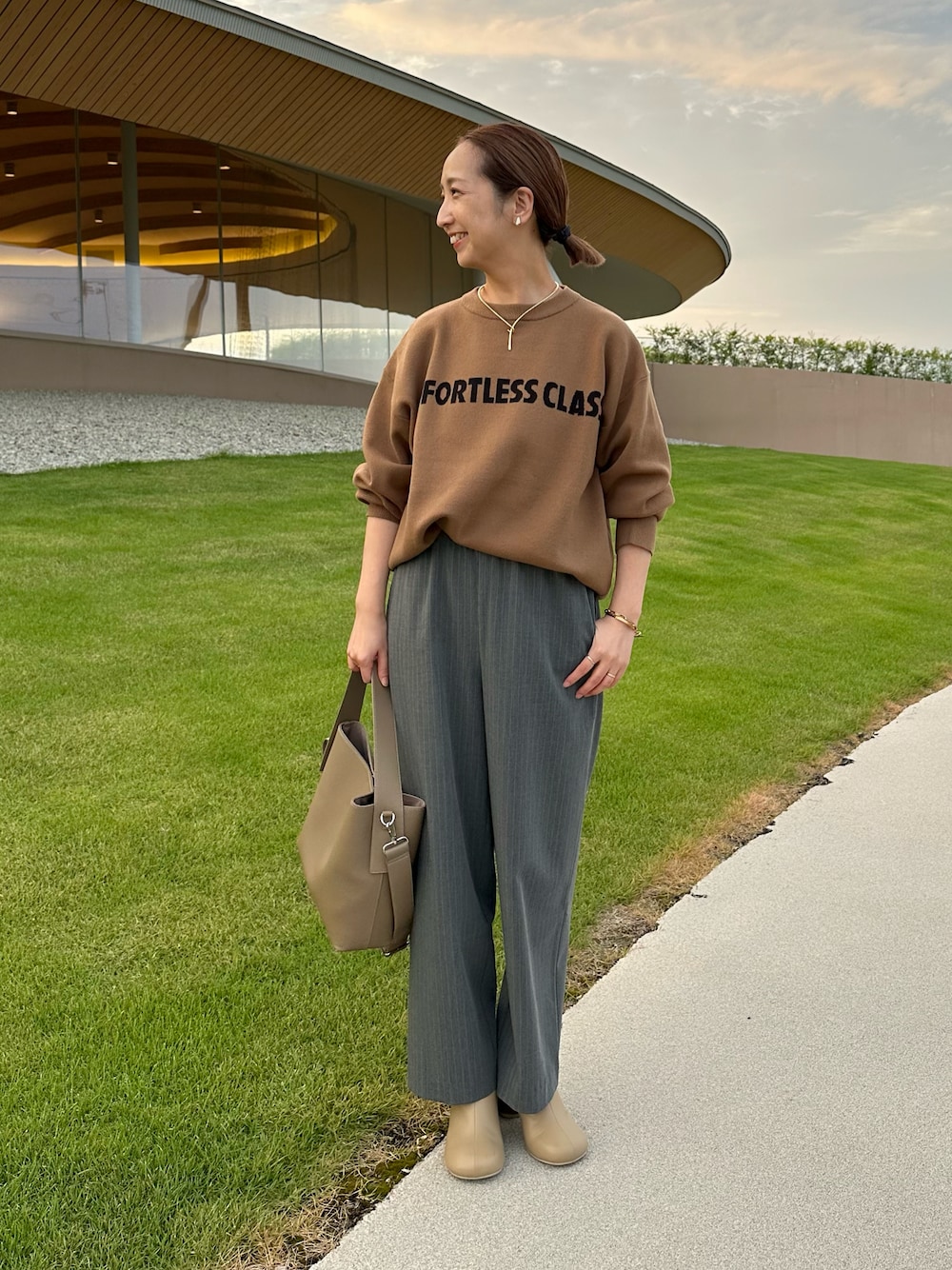 seino企画のニット&パンツ 秋冬らしいキャメルにストライプ柄のグレーパンツを合わせたオトナシンプルコーデ。 小物はベージュでまとめました。