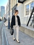 ペプラム型のノーカラージャケットがオトナかわいい卒入学式コーデ。 切り替えがある事で足が長く見え、スタイルアップするジャケットです。 フレア袖もポイントです!