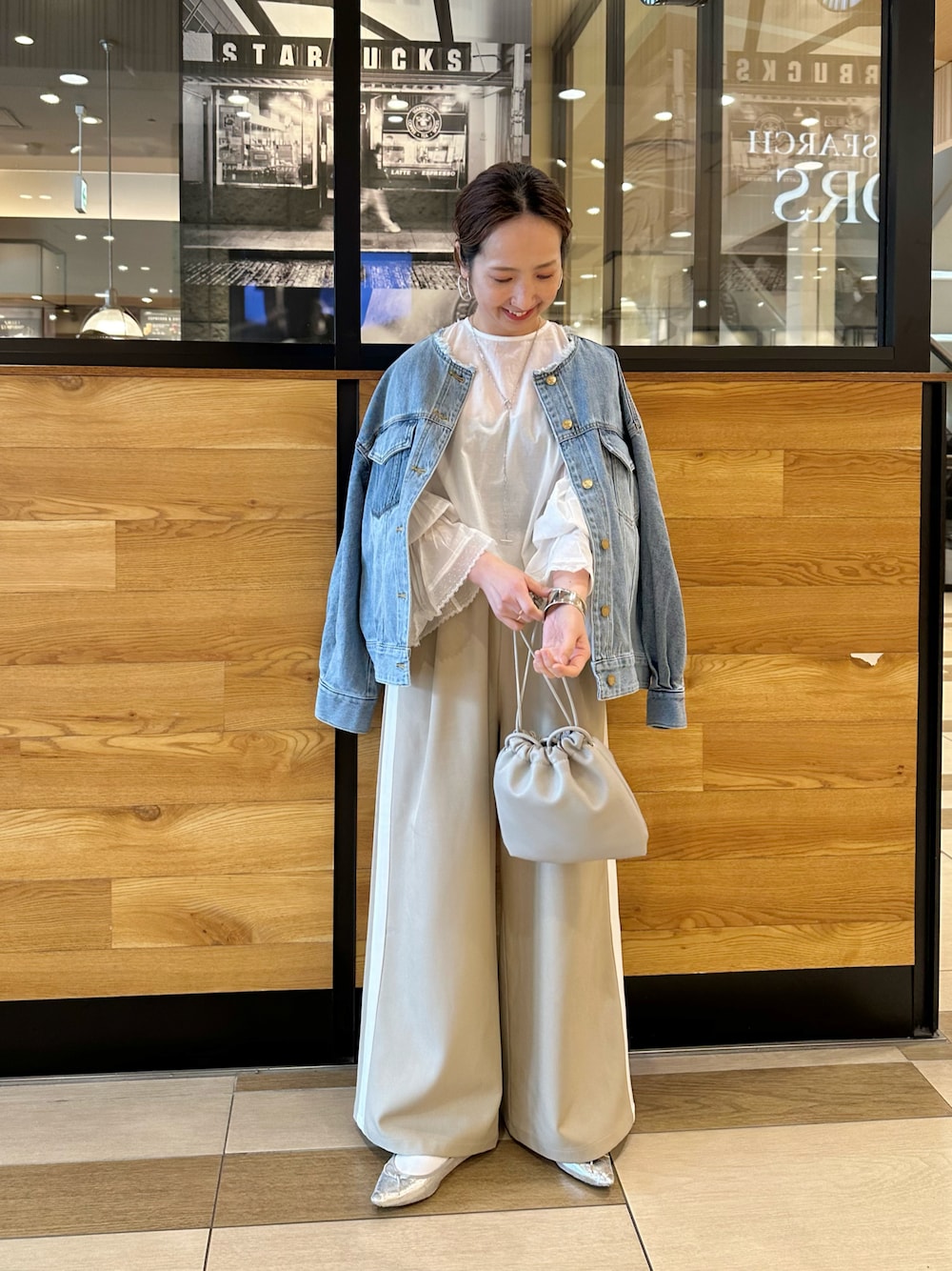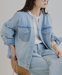春のデニムジャケットコーデ。 ノーカラーのゆったりしたサイジングのジャケットです。