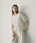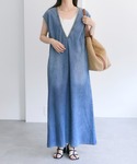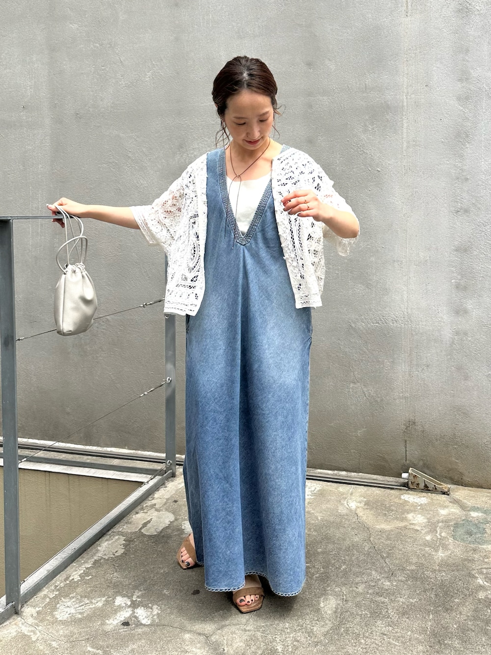 ノースリーブのデニムワンピースに、華奢さと華やかさが可愛いバテンレースのカーディガンを合わせました。