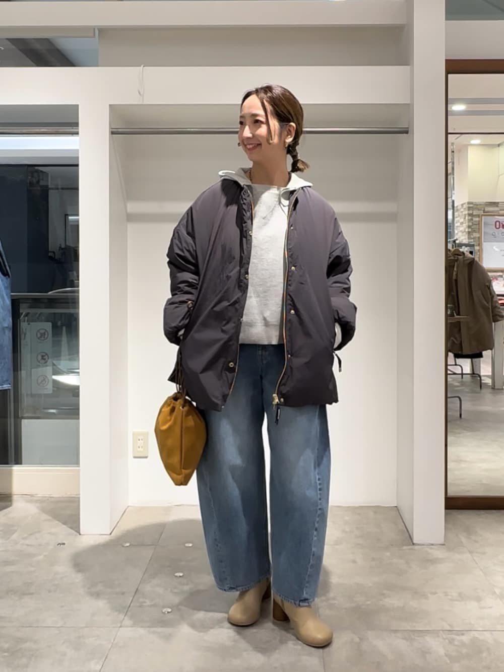 ノーカラーダウン×ニットパーカーコーデ