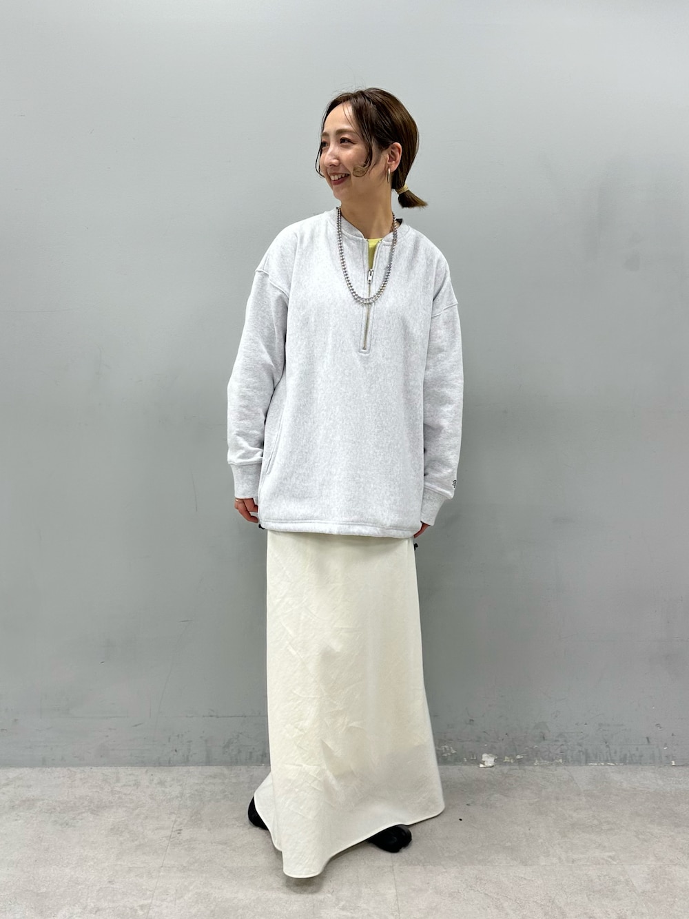 大人女子も取り入れやすいハーフジップスウェットコーデ。 裾はドロストできるのでボトムスに合わせて雰囲気が変えられますよ。