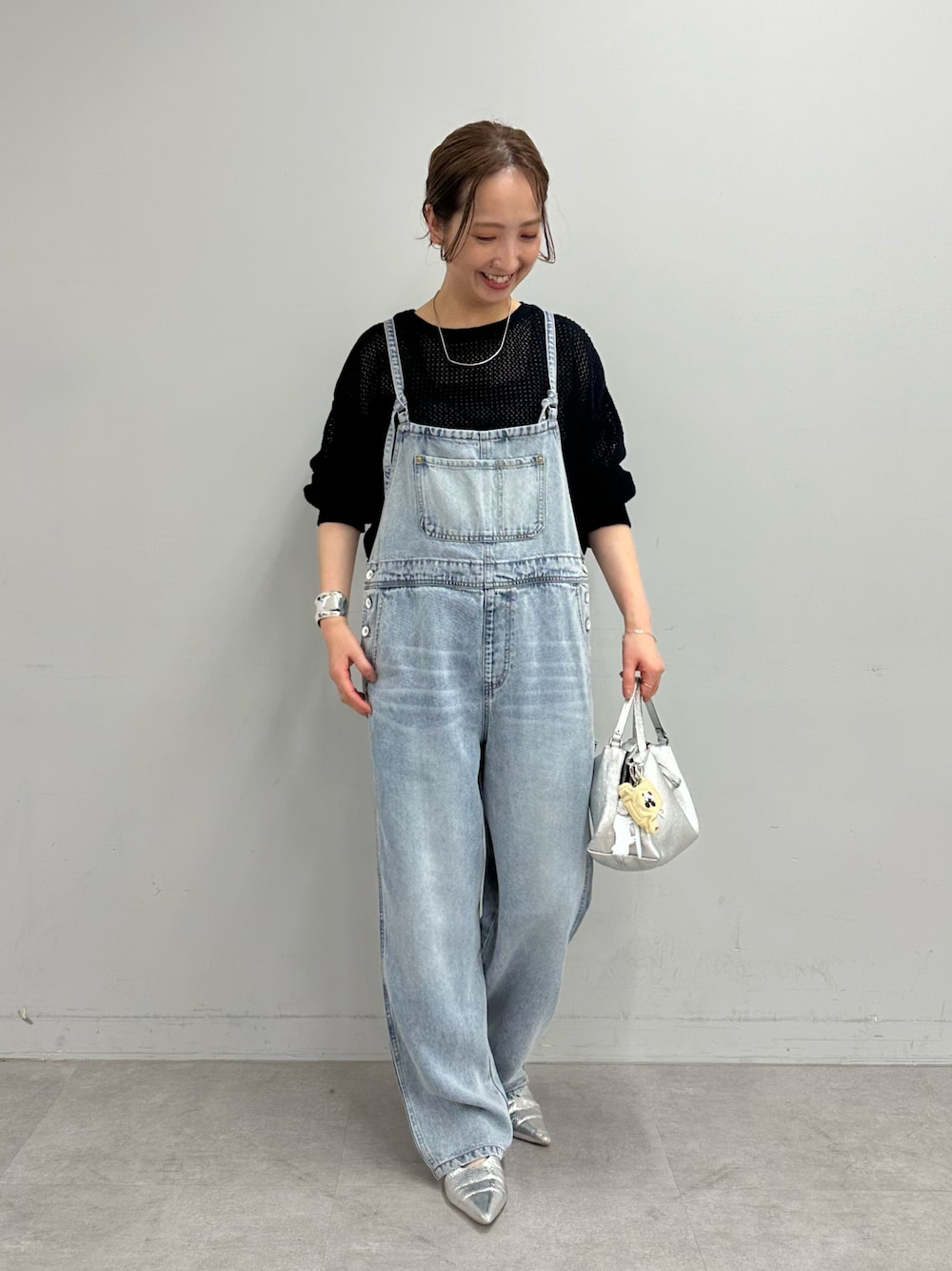 メッシュニットにデニムサロペットを合わせた春コーデ。 サロペットはデニムなのに柔らかくて履きやすく、薄手なので夏も使用可能です。