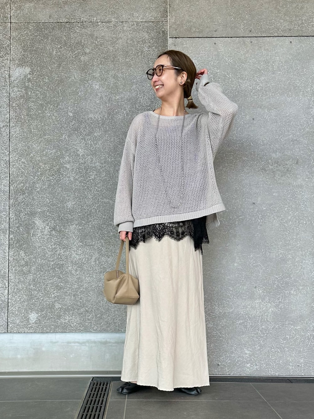 黒レースのキャミソールをポイントにした大人の春コーデ。