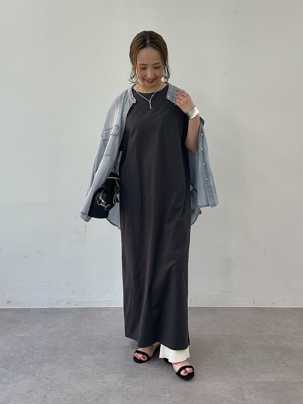 Tシャツワンピースを使ったレイヤードコーデ。 シアーのデニムシャツをサラッと肩がけして春夏楽しめるコーディネートです。 アクセサリーはシルバーで統一しました。