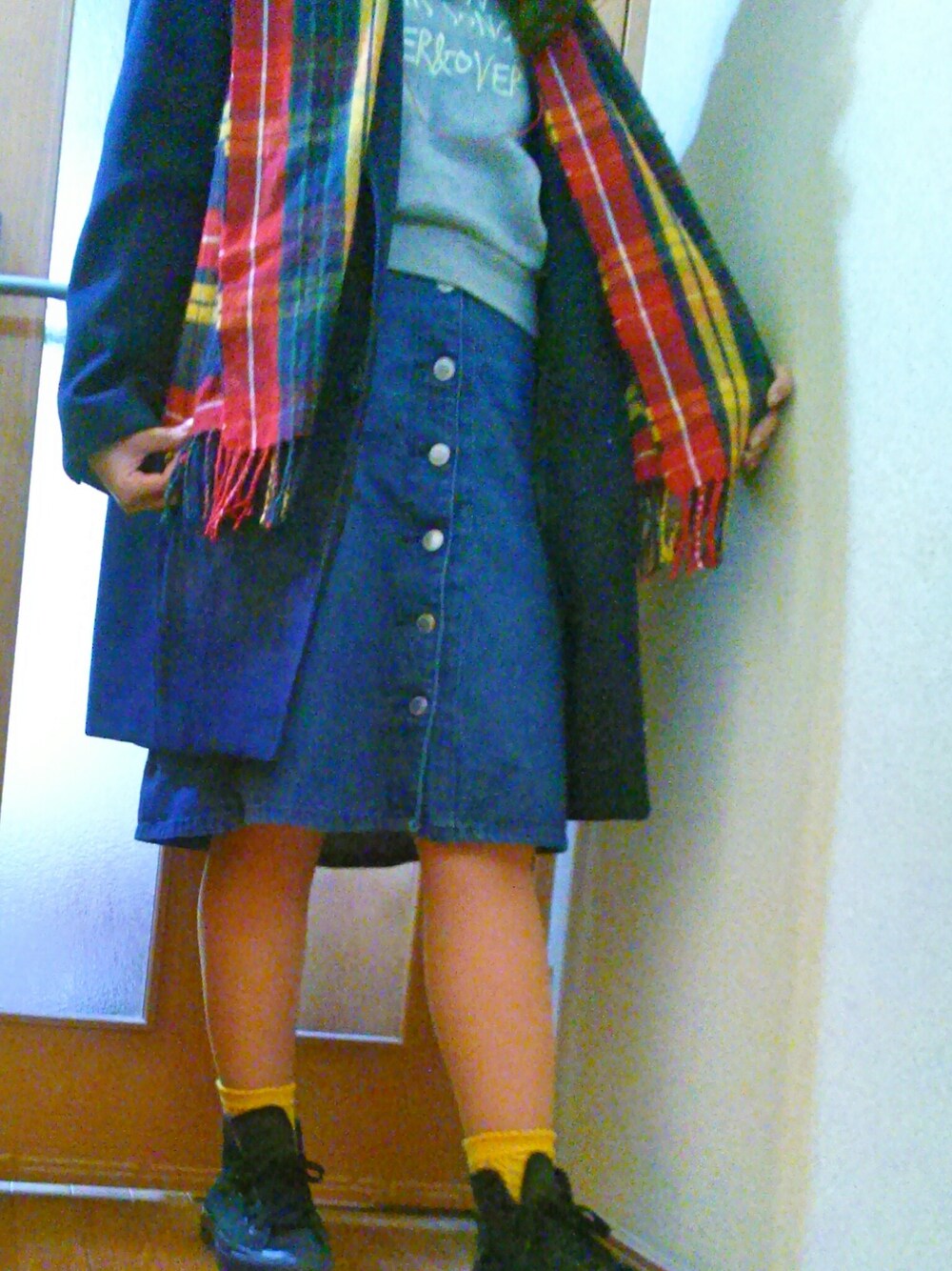足元の黄色で明るめの印象に!寒いときこそ明るい色を!マフラーは色足しです。