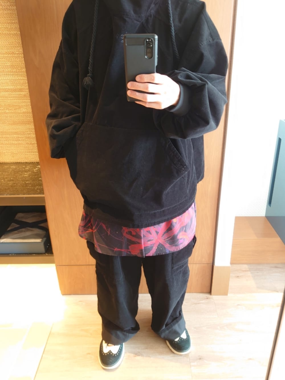 BLVCKとつーちゃんのコラボパーかとパンツ。 ロング丈の服にあわせるコートが欲しくて、一緒にセットアップも。 セットアップきるのなんか部屋着で出てきたん?感が出てしまって苦手意識あったのだけど、彼岸花のシャツでちょいとアクセント追加。