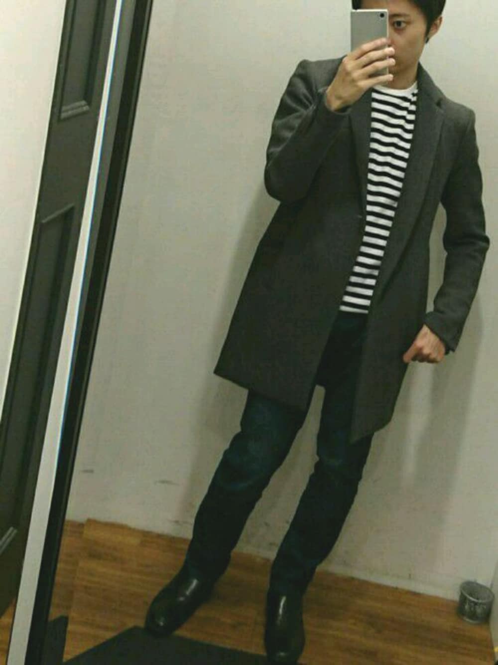 黒と白のボーダーのカットソーでカジュアルに、チェスターコートとスキニーデニムでシックに! 前回のコーデとはインナーが違うだけだけど、雰囲気変わるもんですね! こういうのが好き。