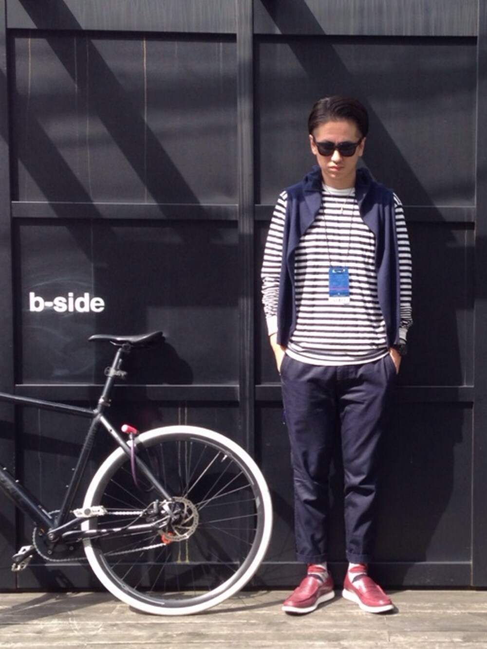 ボーダーロンT、チノパン:DENIM BY VANQUISH & FRAGMENT サングラス:TOM FORD 靴:Cole haan
