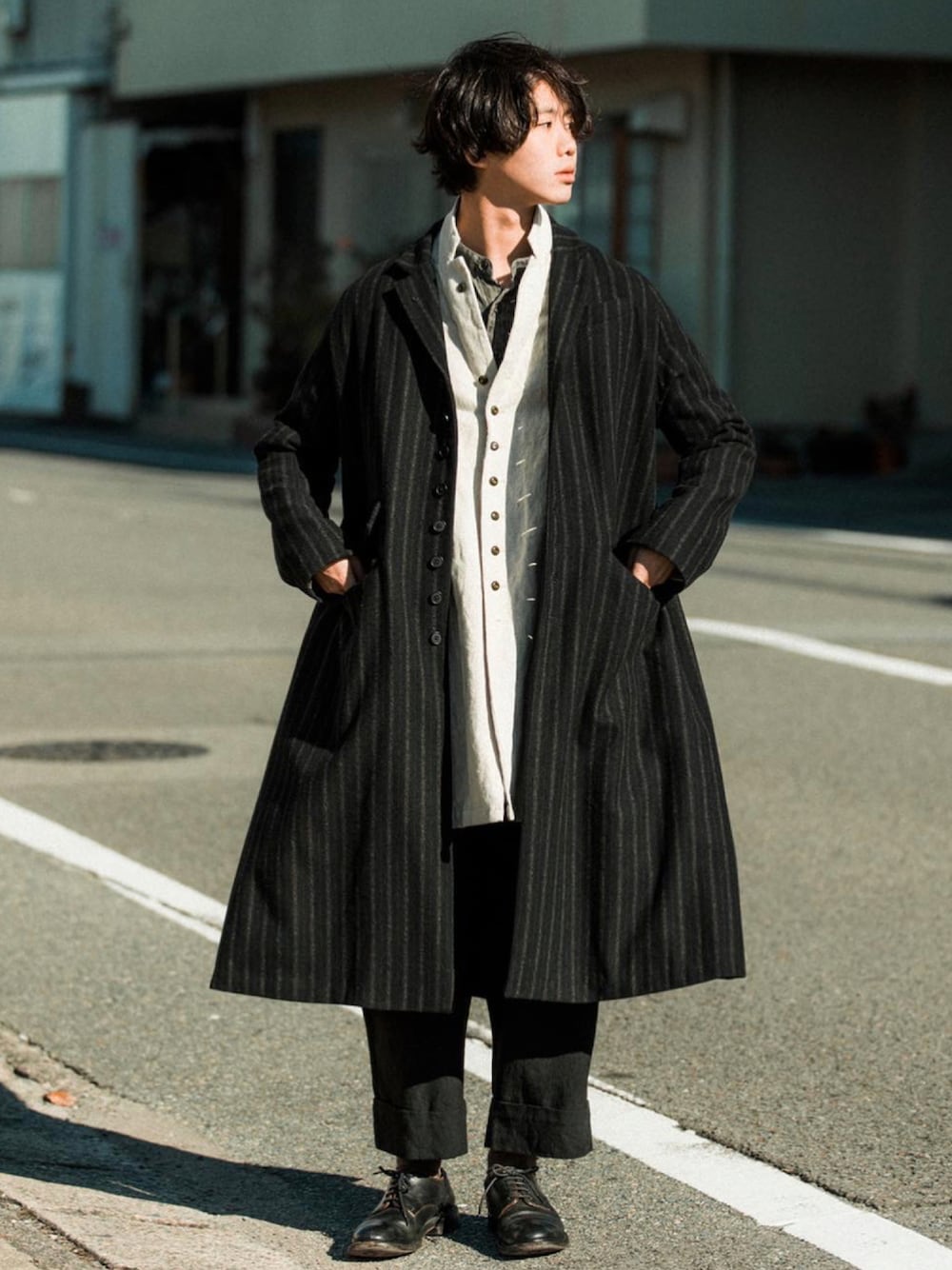 「ワンポイント」って小物や靴下なんかの差し色って印象が強くある気がします。 ただ、個人的マイブームはコーディネートの中に"ワンポイント"ビンテージや古着などの「古いもの」を取り入れるようにしています。 全身新しいもので固めてもいいんだけれど、それだと結局ただの今の時代に生きた人って感じがします。せっかくなら長い洋服の歴史を色々詰め込んだ装いにしてやりたいなっていうすごい個人的な想いです。笑 今回のコーディネートにおいての、古着要素は中に着ているホワイトのシャツコート。 90年代のフランスのベッドシーツの生地が使用されています。