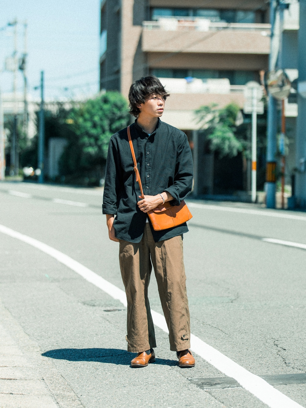 写真では気づかないこだわりではないですが、お気に入りのバッグ。GHOEという地元徳島の革職人が手がけたショルダーバッグ。 スリッポンと色を合わせてみました。同じnaturalでも微妙な経年変化の差が出ています。