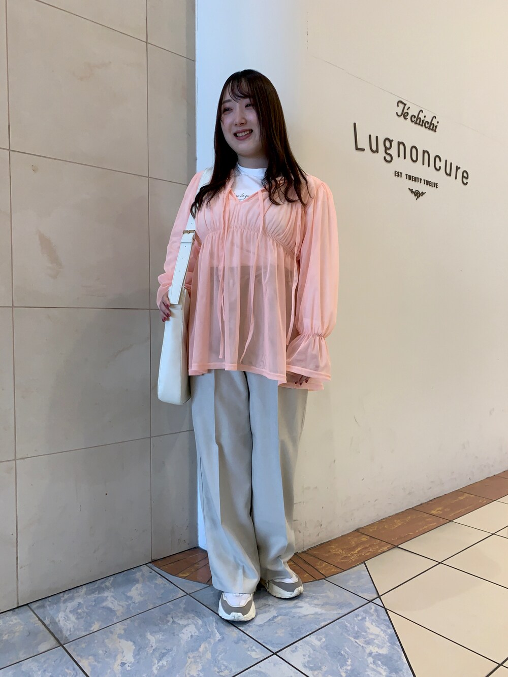 Techichi TERRASSEで春にオススメのブラウス×パンツコーデです! 🤍ブラウス サーモンピンクのようなお色味が華やかで可愛いブラウスです! シアー素材なので、合わせていただくインナー次第でこれから長く使っていただけそうです◎ 前後どちらを前にしても着ていただける2way仕様です! フロントのリボンの使い方次第で雰囲気を変えられるのも嬉しいポイントです🎀 首元をよりスッキリ見せるため、今回はリボンを結ばずに着用しております! 今回はカジュアルにTシャツで合わせてみました! 🤍Tシャツ 抗菌防臭加工が施されているTシャツです! ピタッとしすぎない、ゆったりとしたサイズ感なので着用感もかなり楽です! お色によって違ったロゴプリントでございます! オフホワイトはプリントロゴが小さめで、カジュアルな印象になり過ぎないので、普段フェミニンなコーディネートが多い方でも取り入れていただきやすいと思います◎ 1枚持っていていただけるとコーディネートの幅が広がります! 🤍パンツ 店頭でも大人気で、色違いでご購入してくださる方も多い、イージーケア仕様のストレートパンツです! ウエストリボンはコーデのポイントにもなり、ウエストのサイズ感の調節も可能です◎ しっかりとした素材感かつゆったりシルエットで肉感を拾わず、とっても楽な履き心地です! 158cmでLサイズを着用いたしました! Mサイズと比べてウエスト+6cm、総丈+5cmになるようです◎ スニーカーでも引きずらないですが、身長158cmでかなりゆったり長めの丈感になります! 同じくらいの身長の方で、ヒールのないタイプのお靴でお召になりたい方にはMサイズがオススメです! 🤍バッグ ノートやiPadなどもすっぽり入るサイズ感で、通学にもオススメのバッグです◎ ショルダー部分はベルトで長さ調節も可能です! その日のコーデに合わせて使い分けていただけます! やや黄みがかったオフホワイトは、お手元に馴染みやすく使っていただきやすいです! バックル部分もゴールドで可愛いです✨ 少しでも参考になれば幸いです!