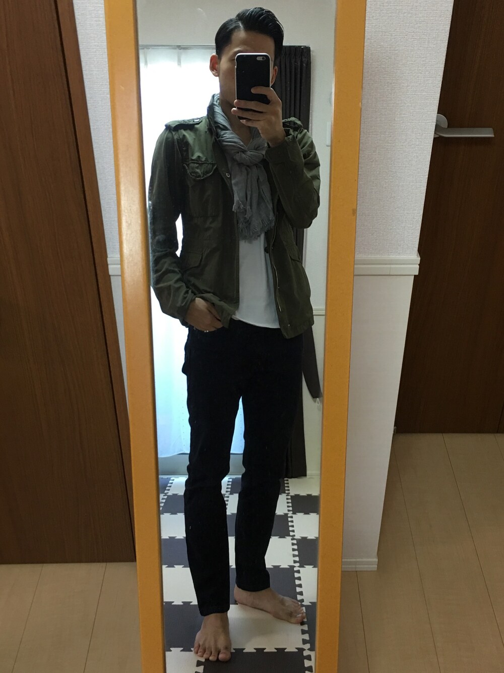 少し涼しくなったので長袖。 ミリタリーだけどキレイめな感じを出すためにストールを巻きました。 巻き方見ながらやったけど、これであってるんでしょうか?トーシロ感丸出し。