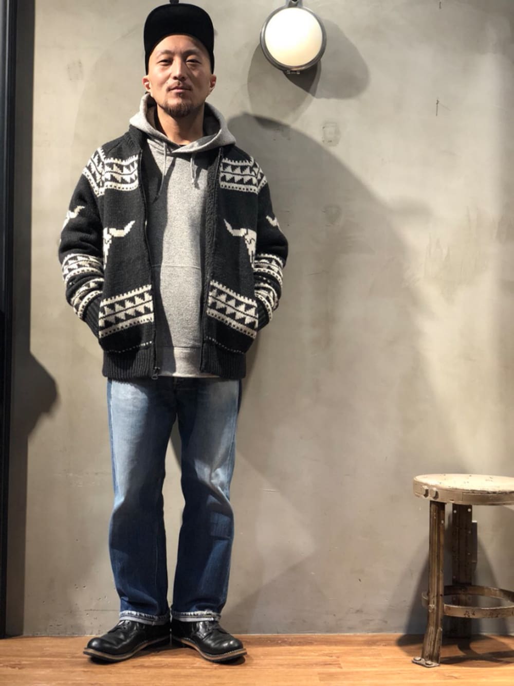季節感のあるカウチンは冬の到来を楽しみにさせます。 ブラックベースの配色にネイティブっぽいバッファロー柄、とてもカッコいいです。 シンプルに古き良きアメカジなスタイリング。 久しぶりに穿いたヴィンテージ501Eとも相性バツグン。 コストパフォーマンスが高いのも魅力的です。