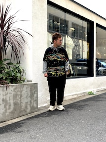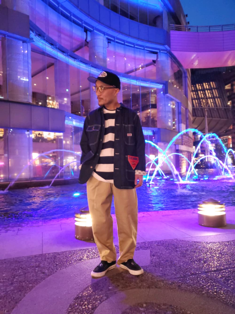 サイズアップでゆったり穿いたシェフパンツにデニムカバーオールで春先スタイリング。 リニューアルしたボーダーが映えます。 キャップ、めがね、スニーカーなど細かいところも手を抜かず、でもキメすぎない自然な感じで☺