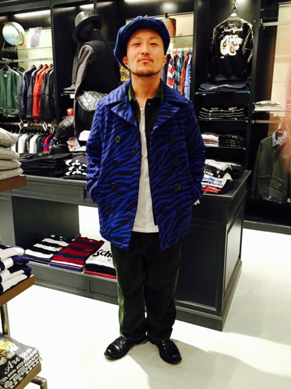 インパクト大のオリジナルゼブラ柄ウールを大定番753USピーコートに落とし込んだ今季注目アイテム。 コーデュロイセットアップにざっくり羽織り、さらにキャスケットもゼブラ柄で合わせてダブルセットアップ! 大人のやんちゃウインタースタイルとでも言いましょうか。
